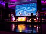 Take a seat in the candy swirl photo space for a psychedelic snap surrounded by giant flowers on a grass armchair! You can also pose in a gondola in front of the famous chocolate river. Guest tables are dressed with bright LED table and striped table runners, the scene is set for you to party the night away!